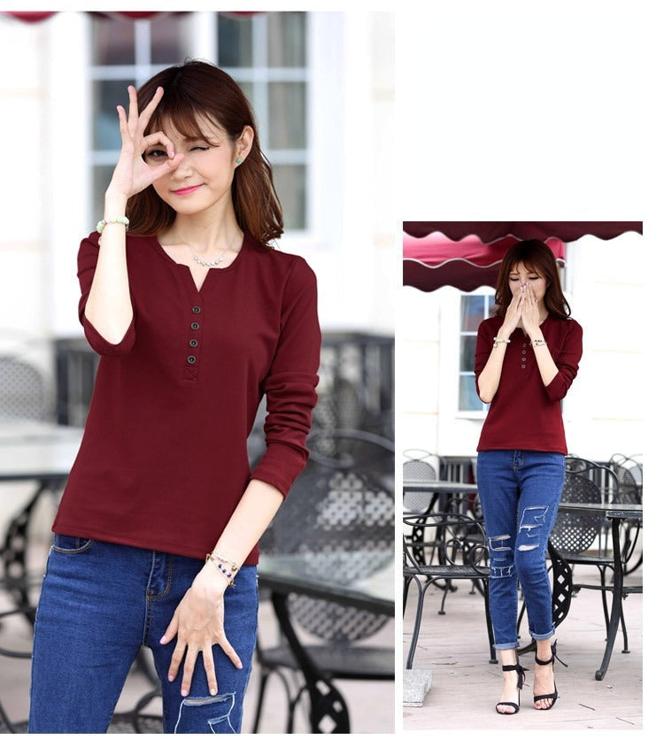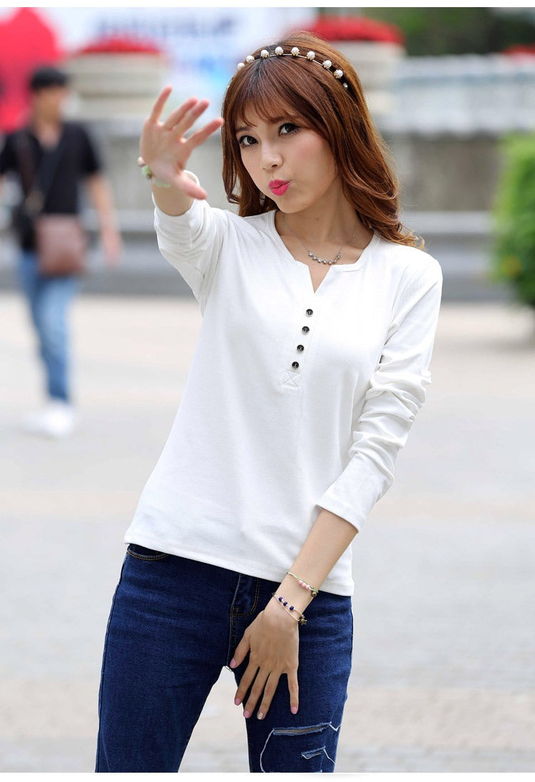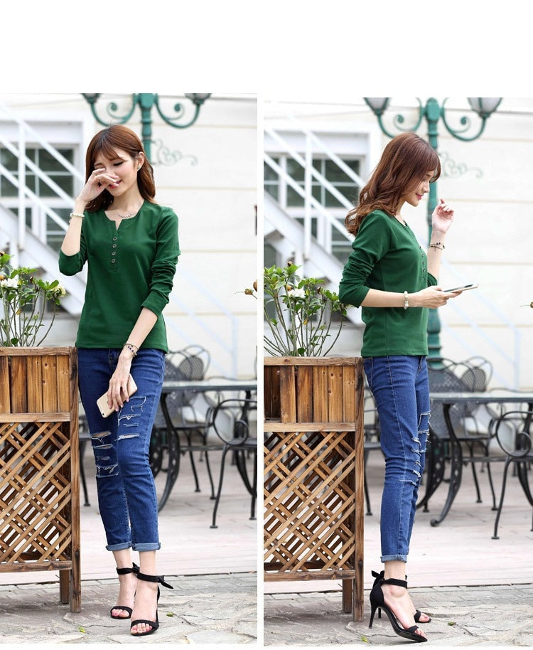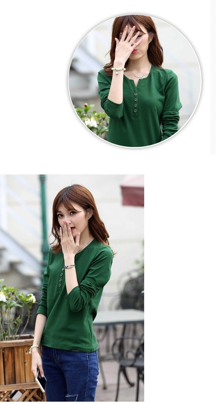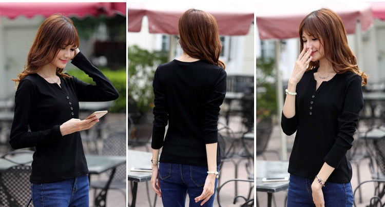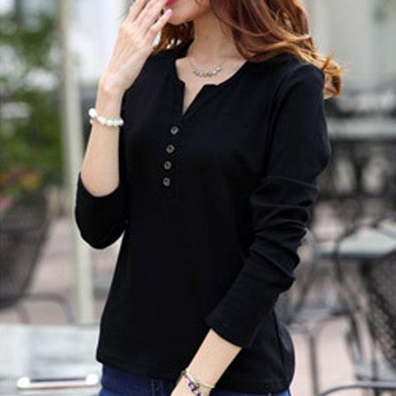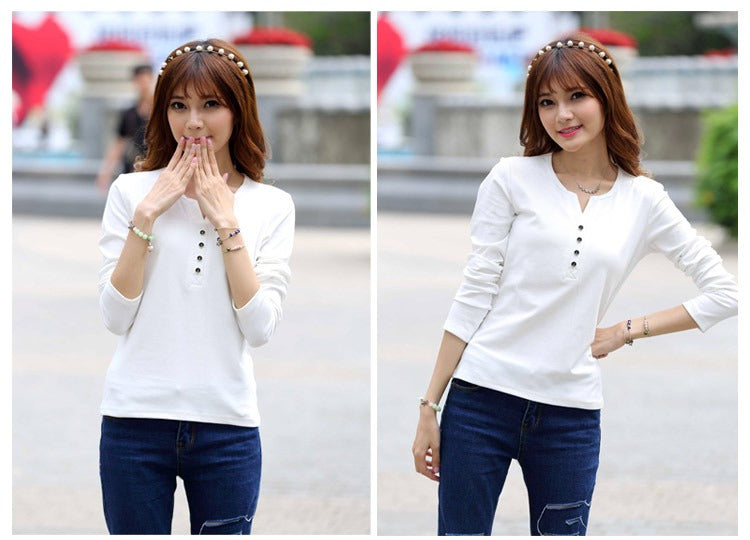Autumn Fashion Long Sleeve T-Shirt Tops with Button Decoration for Women