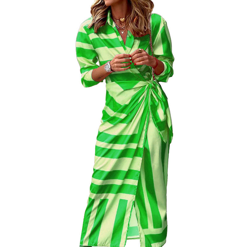European And American Style Cardigan Lace-up Striped Printed Dress