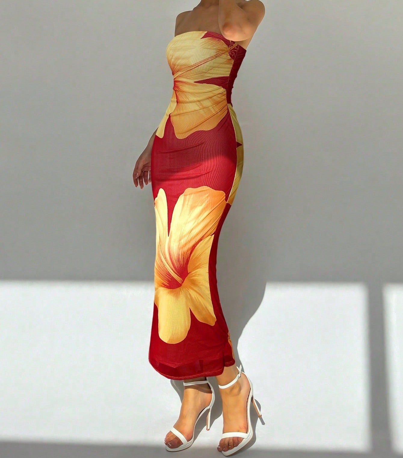 New Women's Slim-fit Contrast Colors Floral Print Dress