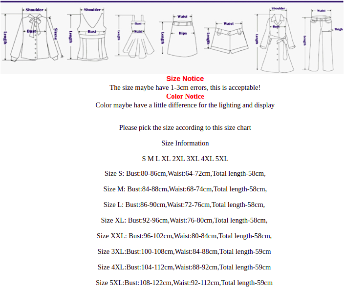 Size 3XL: Bust-102-108cm Total length-59cm Waist-84-88cm