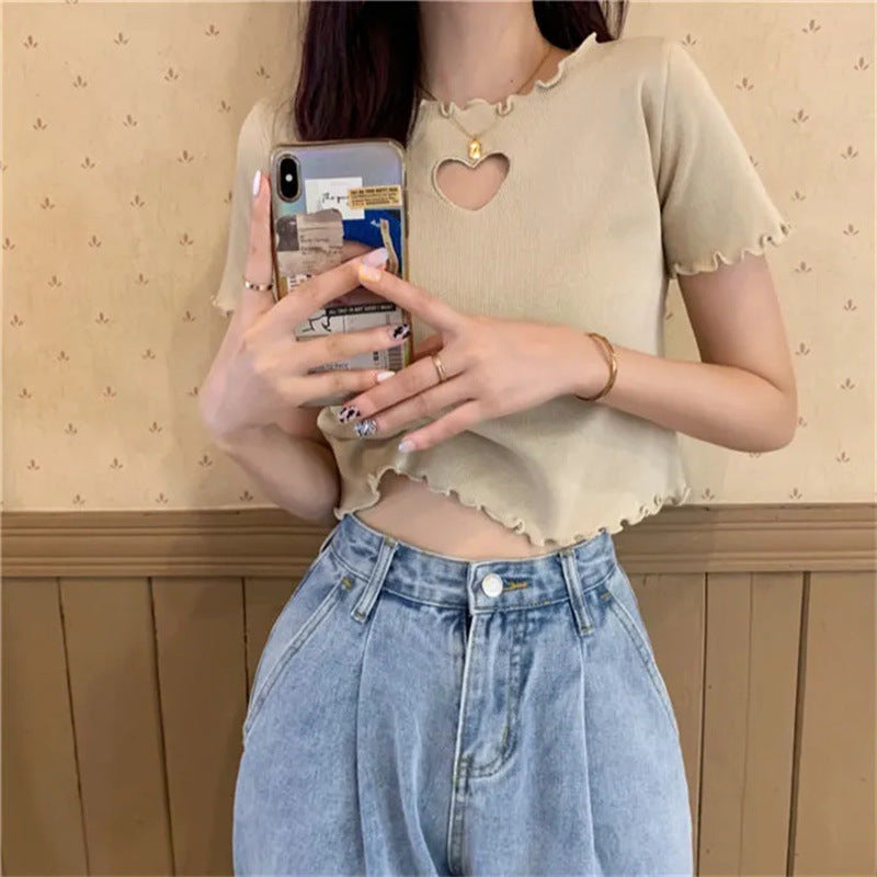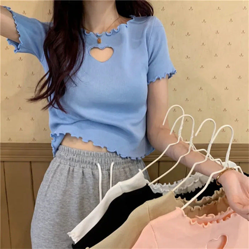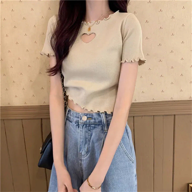 Short Hollow Out Love T-shirt With Wooden Ear Edge Top