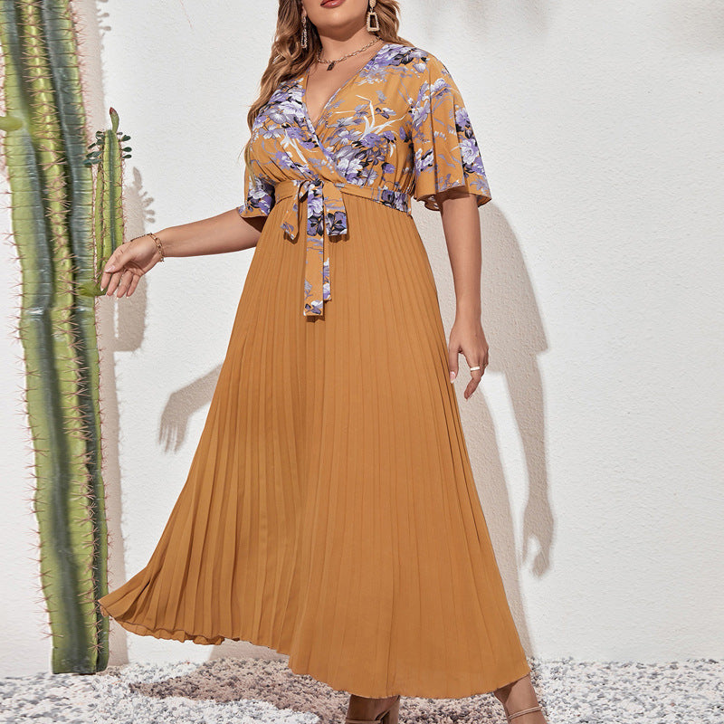 Temperament Printed Lace-up Waist Pleated V-neck Short Sleeve Dress
