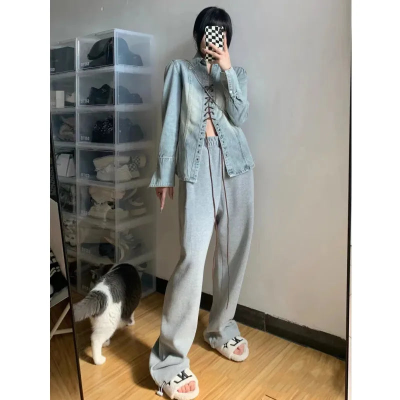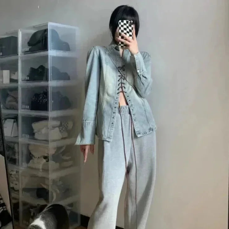 Women's American Retro Punk Lace-up Leather Strap Denim Long Sleeve Shirt