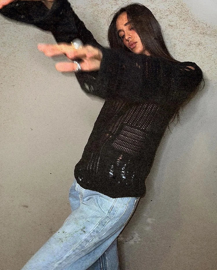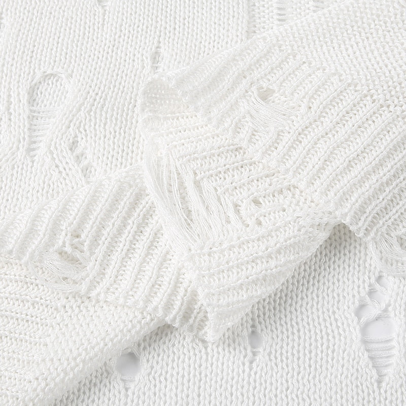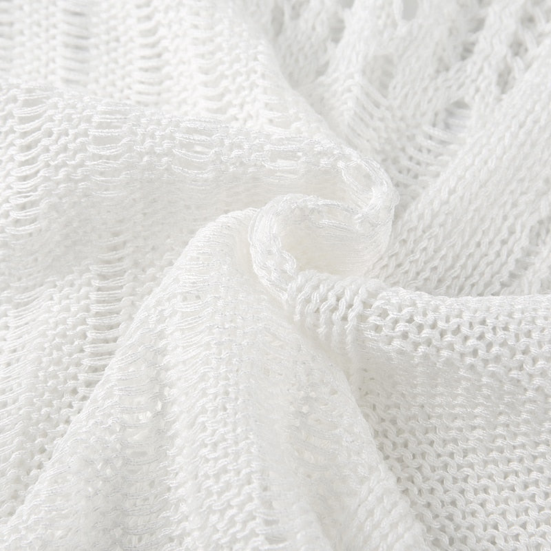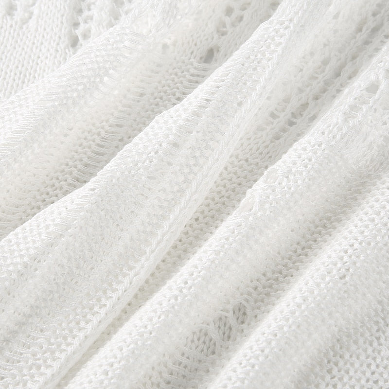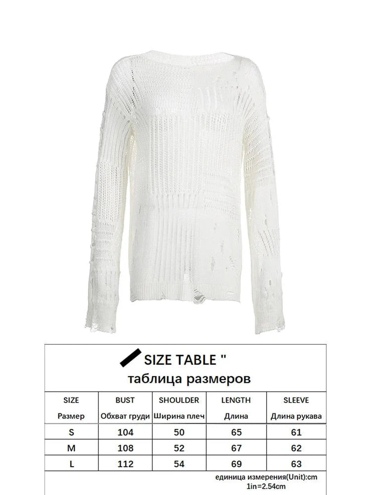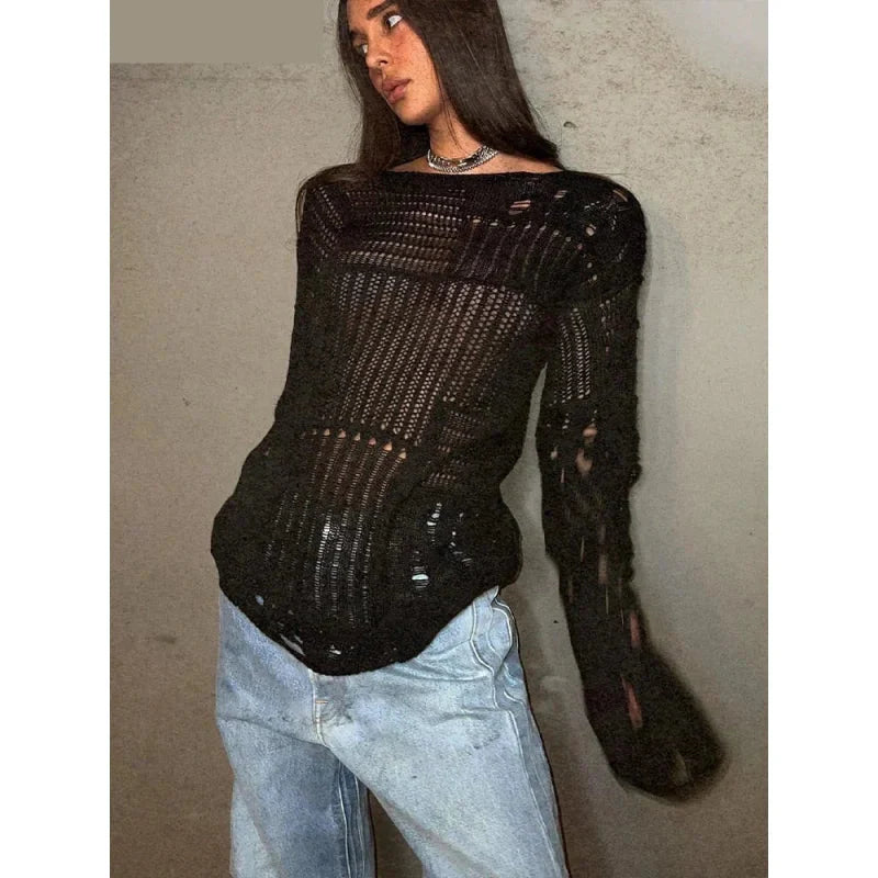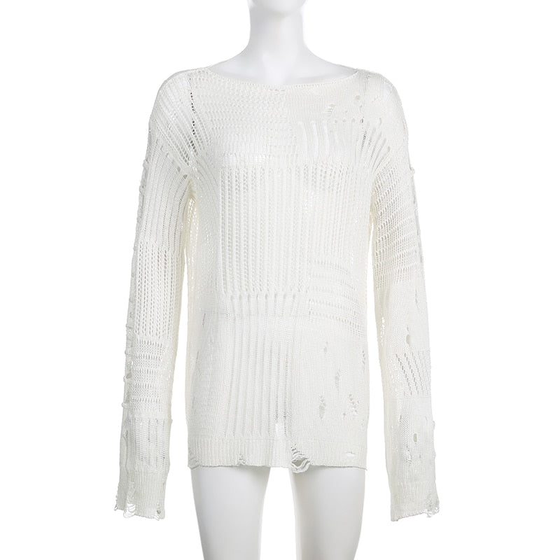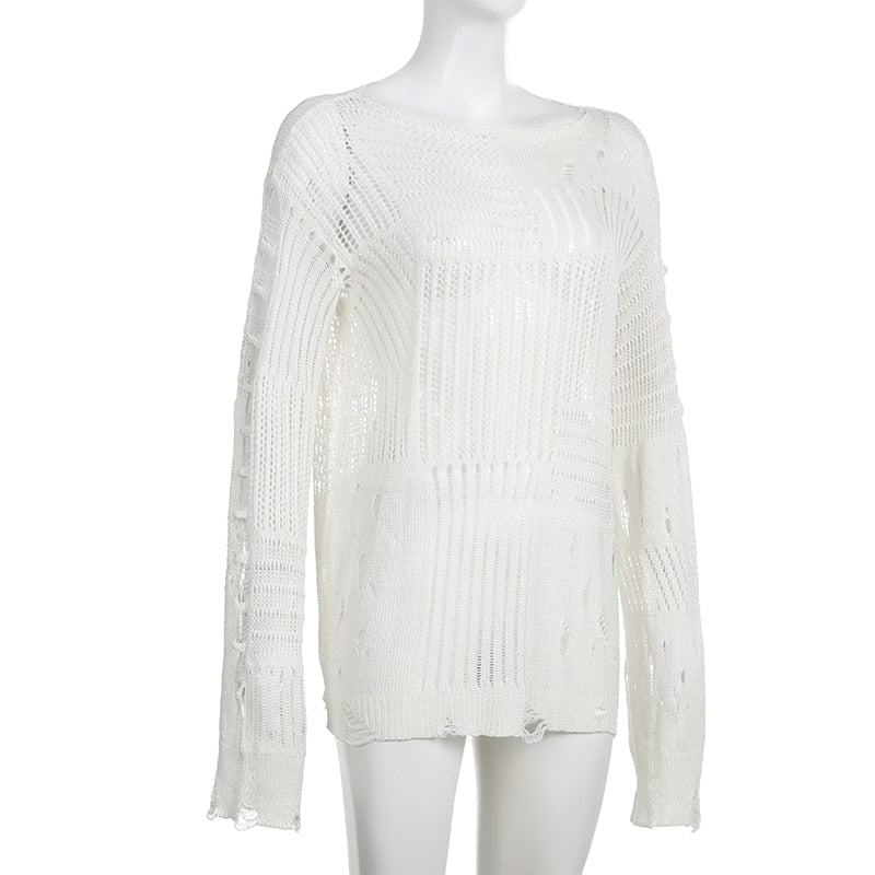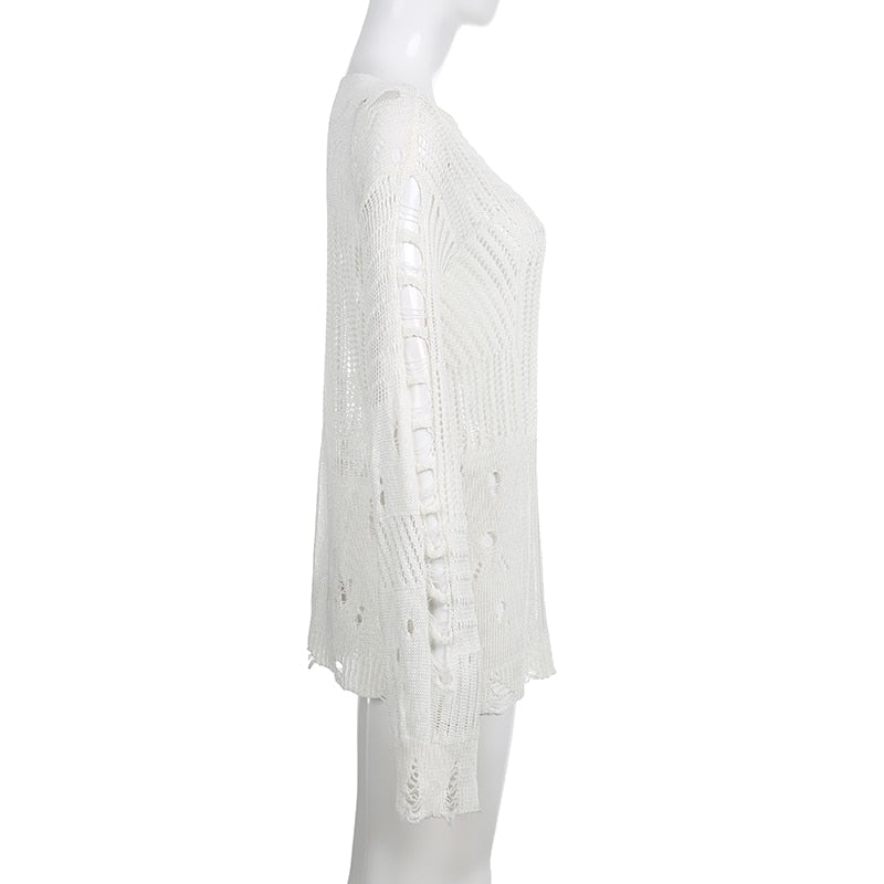 Women's Basic Solid Hollow Out O Neck Long Sleeve Knitted Loose Shirt
