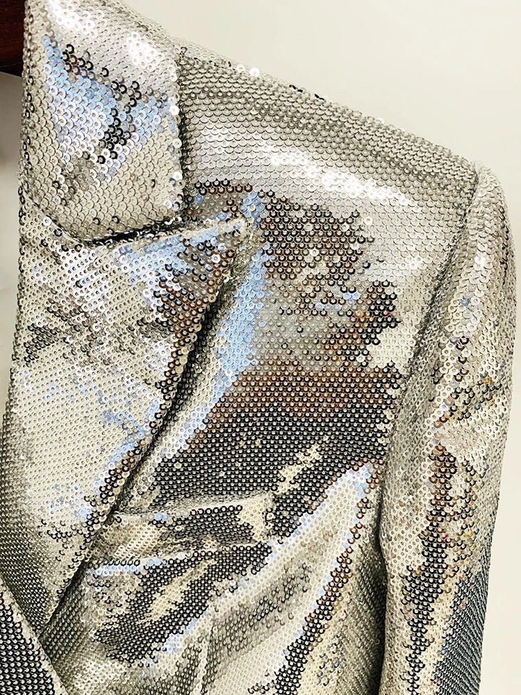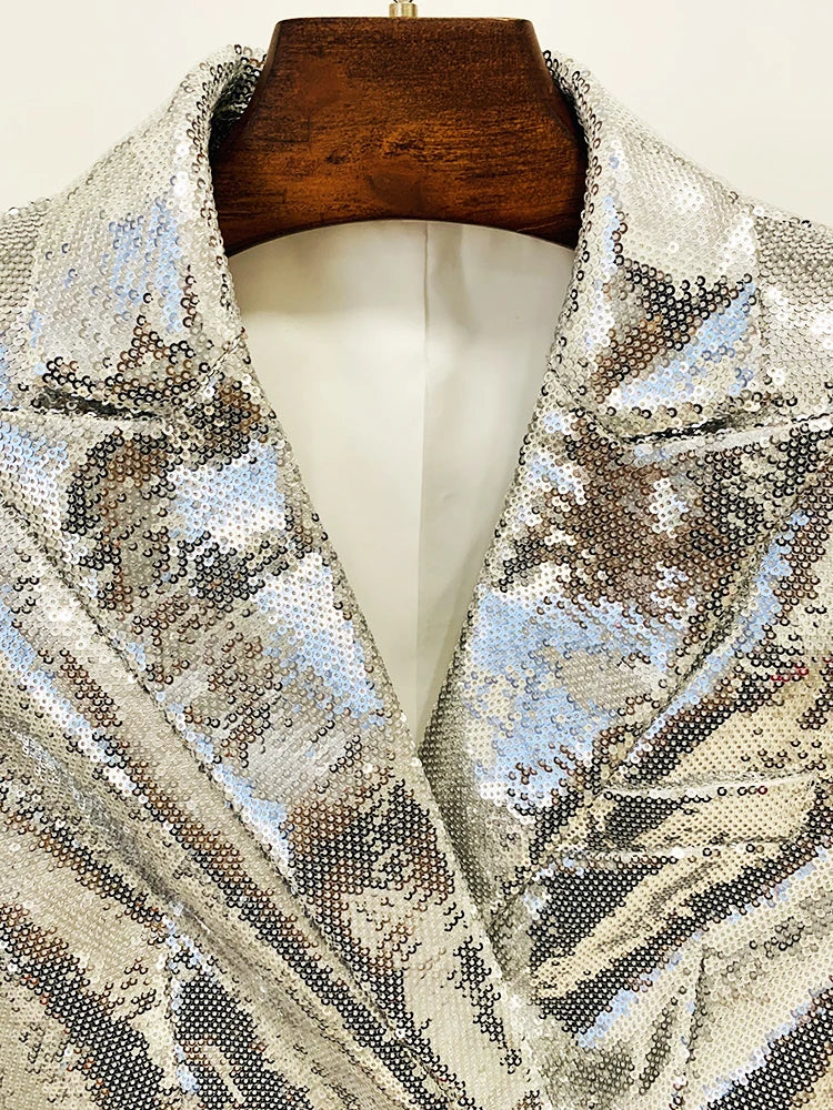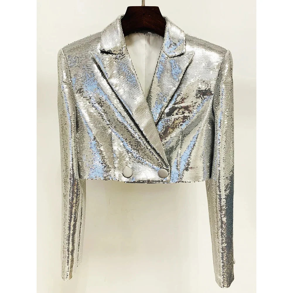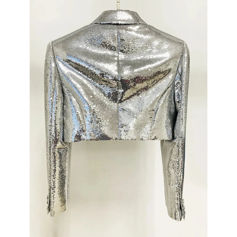 Women's Glitter Sequined Notched Collar Crop Jacket Mini Skirt Two Piece Set