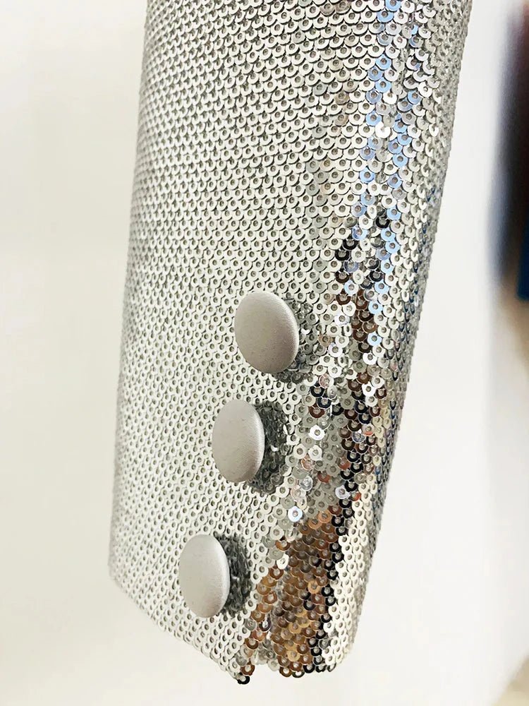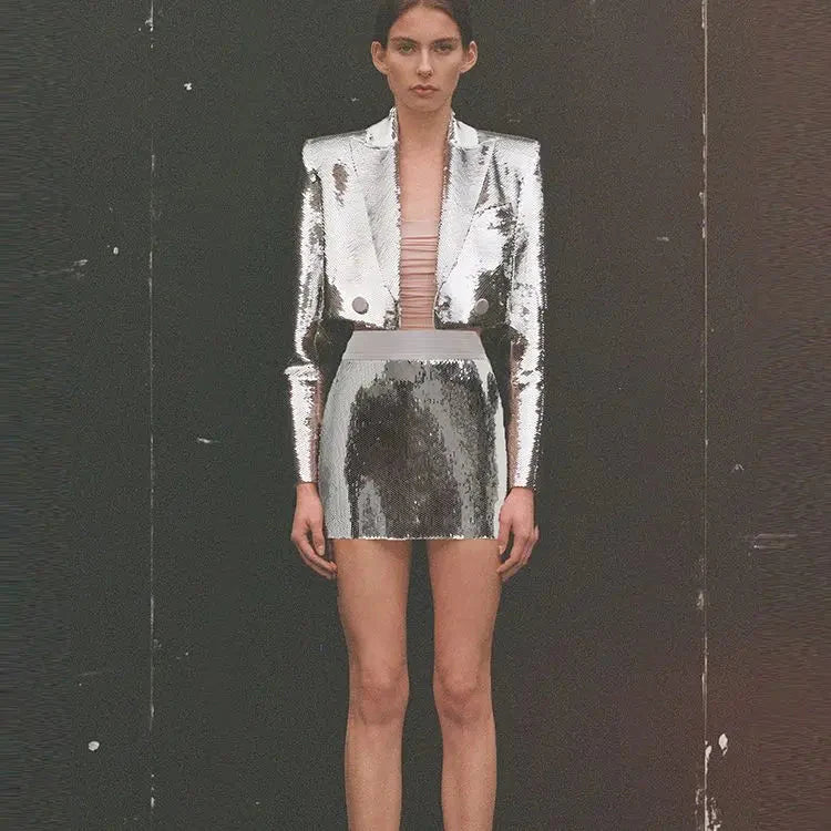 To infuse a touch of class into your style, consider this sophisticated 2pcs set tailored for women. Crafted from high-quality polyester, the long-sleeved cropped jacket features a notched collar and a single-button closure. The dazzling sequin and glitter decorations add a glamorous touch. The accompanying mini skirt completes the ensemble, making it a perfect two-piece set for making a lasting impression. Don't miss out--go, grab it now!
