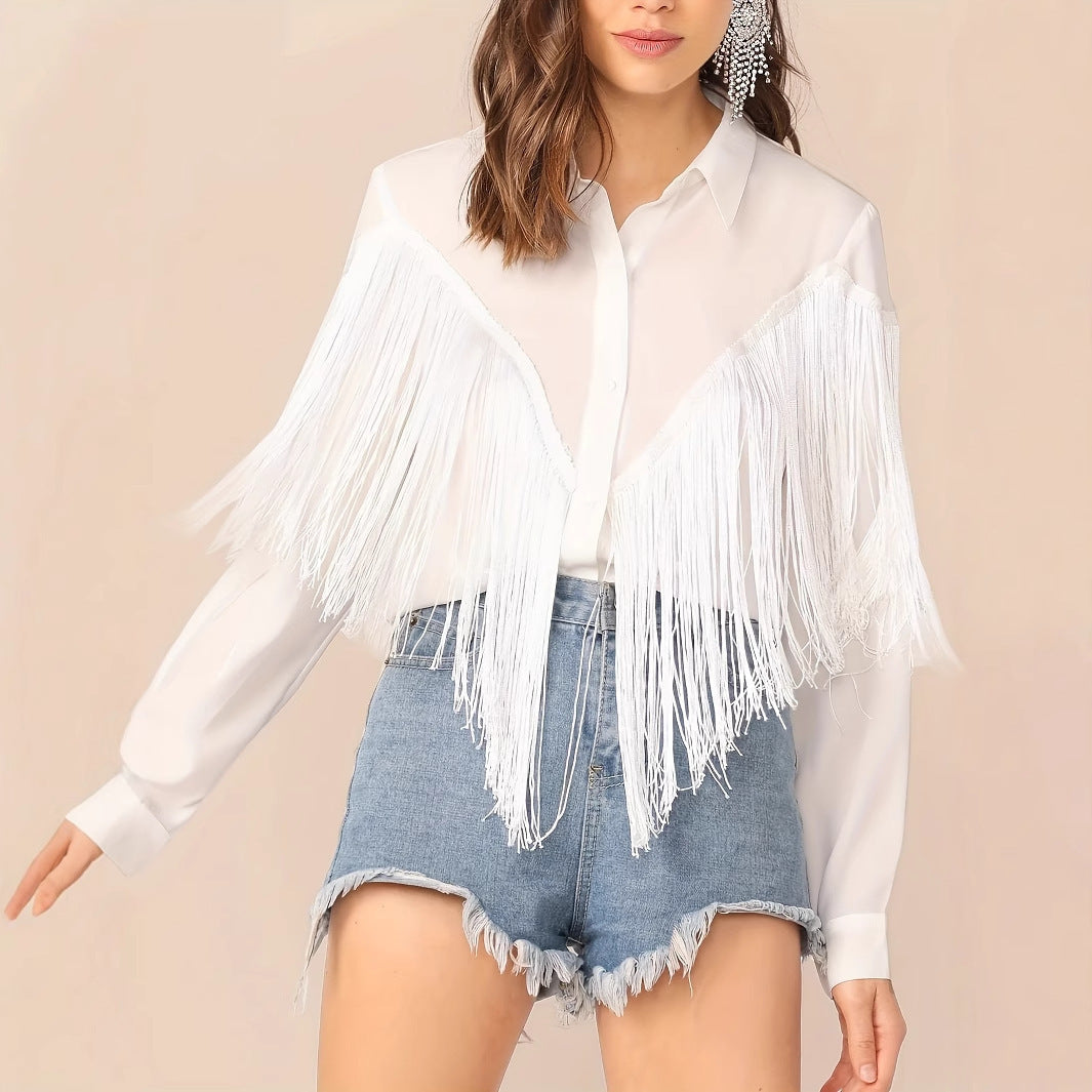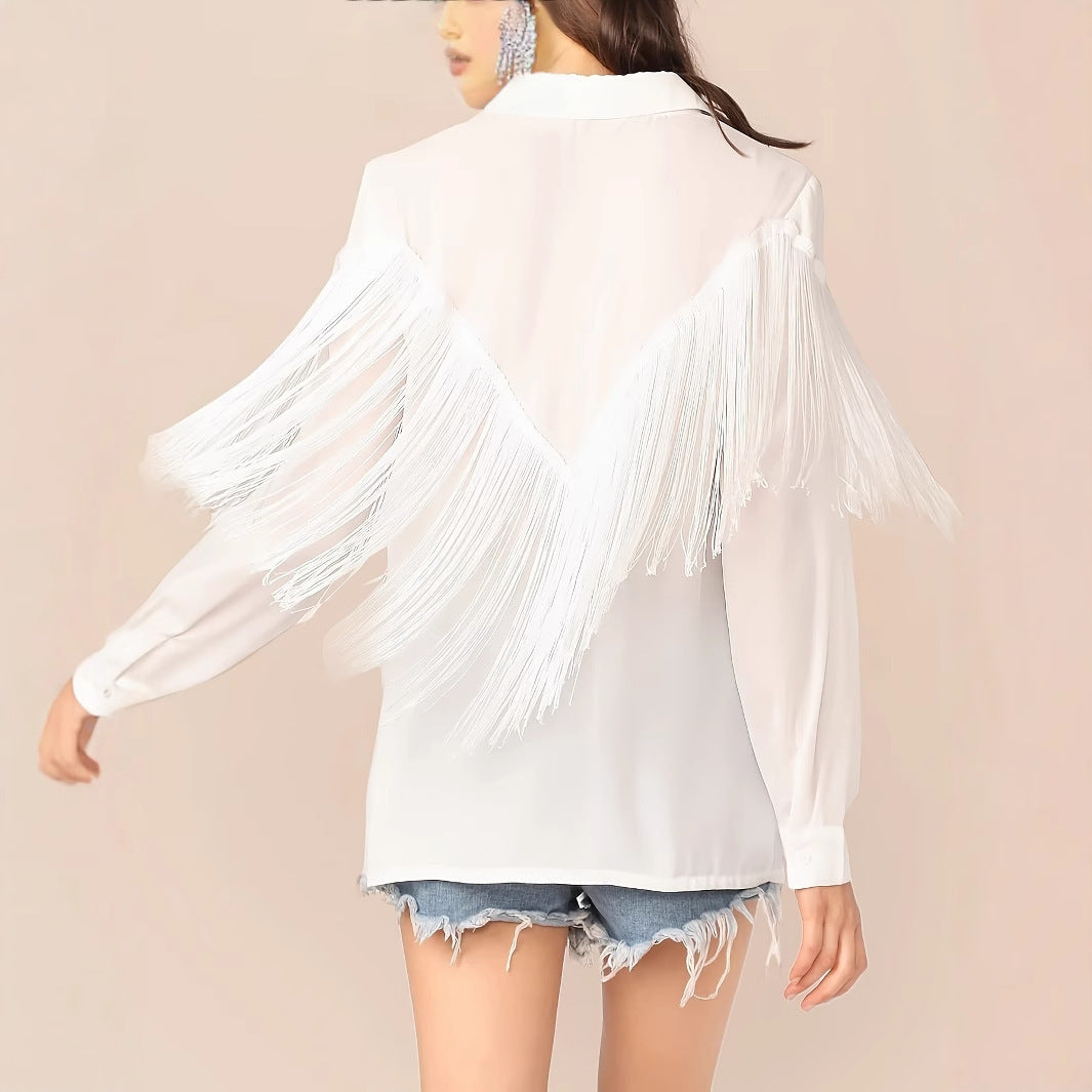 Women's Solid Color Tassel Decoration Long Sleeved Commuting Shirt Loose Casual Top