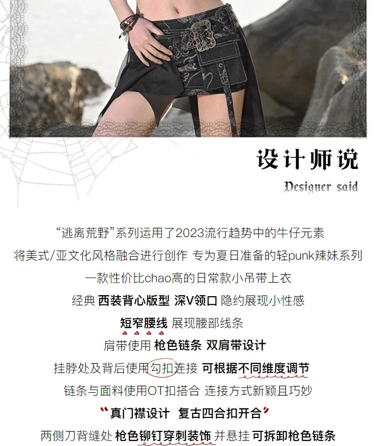 Revitalize your wardrobe with this punk-inspired crop top, the ultimate choice for a bold summer look. Designed with spaghetti straps and an eye-catching dragon print, it adds an edgy flair to your look. Made from durable polyester, this top features rivets and metal chain embellishments for a stylish touch. With its unique style and top-notch materials, this crop top is a must-have for those who want to stand out.